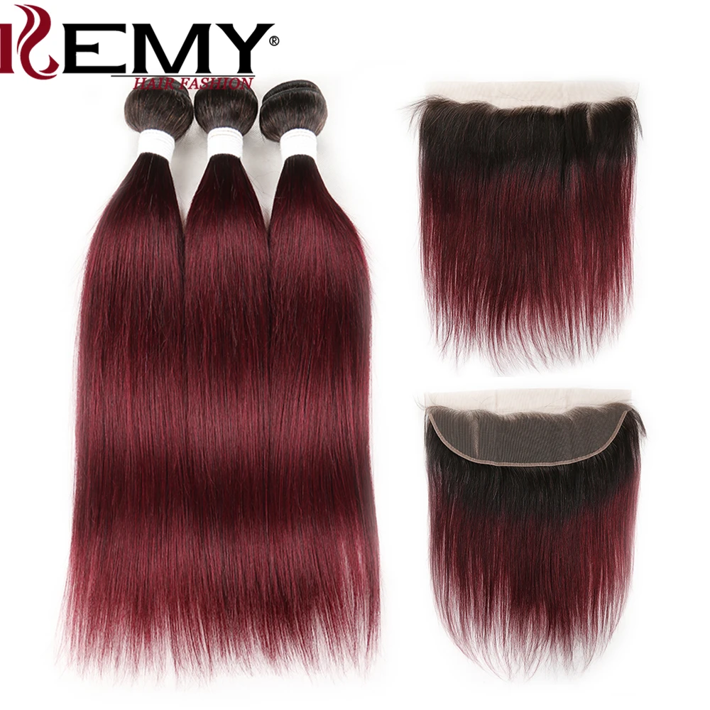 T1B/99J Ombre Hair Bundles With Frontal 13x4 KEMY HAIR 3PCS Brazilian Straight Human Hair Weave Bun